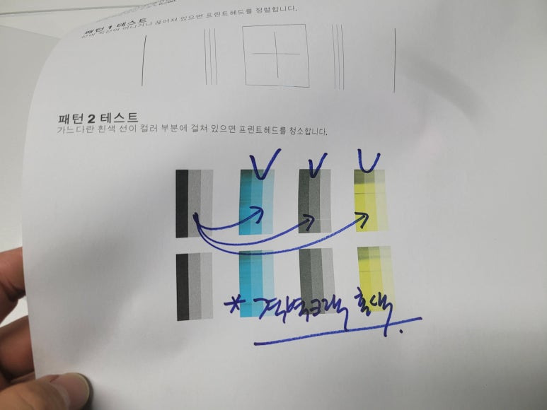 ⚠ 이상 시에만, 액정에서 설정 ➡ 유지 및 보수 ➡ 헤드청소 3단계 1회만 진행 (개선없다면 수리요청)