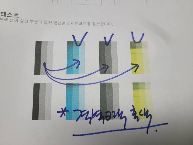 2) 매일 체크하지 않으면 노즐이 미세하게 막히면 헤드 청소를 해야 하는데 헤드청소시 이때, 잉크가 정말 많이 사용됩니다. 잉크 낭비까지 생각한다면 평소 출력해 체킹하는 게 좋습니다.(고지혈/동맥경화시 의료비가 듭니다)