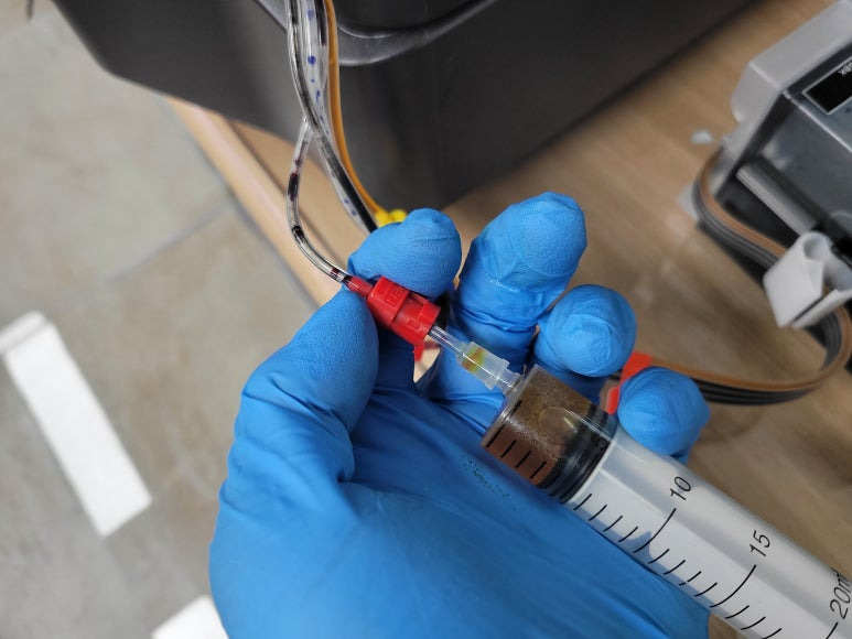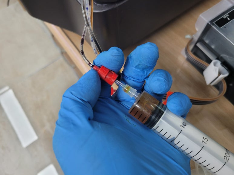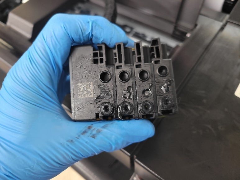 ● 잉크공급라인 내부 잉크경화 정액 주입 세척 불가로 교체