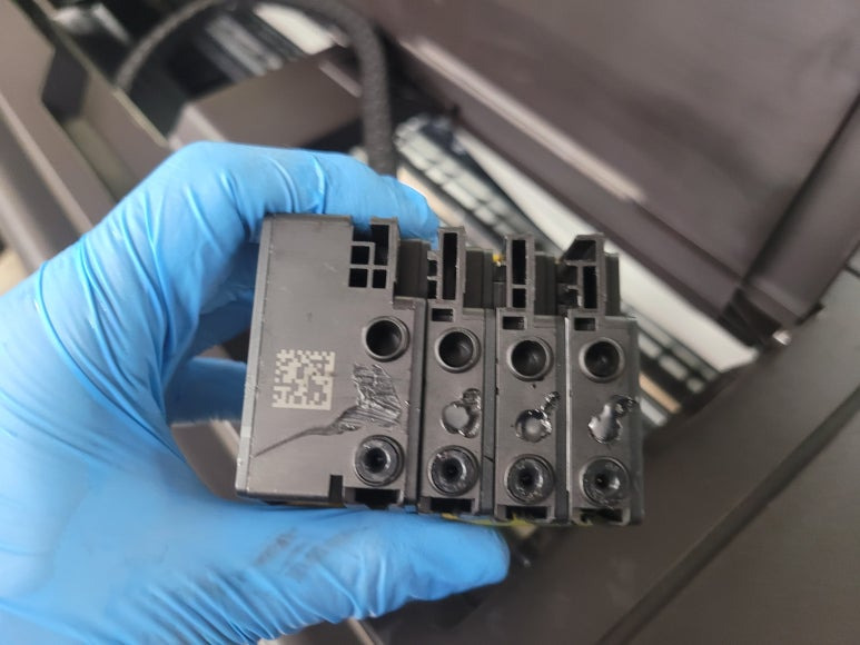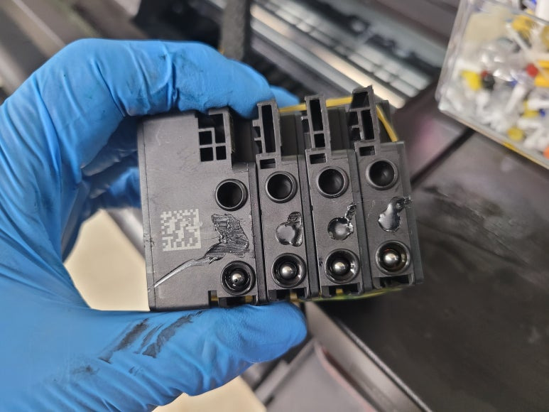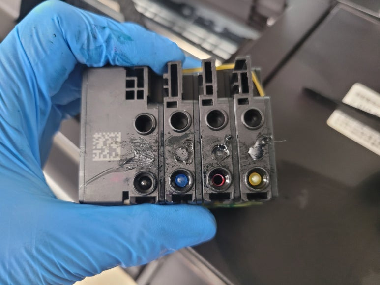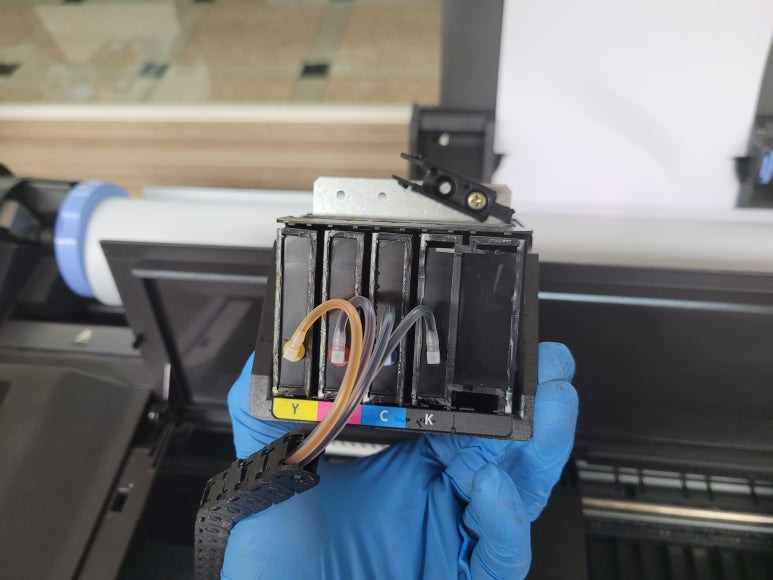 출력불량 및 잉크 카트리지 문제로 빠른 전체 점검 필요 이유 : 1. 호스 내 잉크 경화로 잉크공급 不 2. 카트리지 부싱 및 패킹 노후로 공기유입으로 잉크공급 不 3. 헤드 內 잉크공간 챔버 터짐 (칩판부 슈팅에어라인 비닐탈락, PCB 오염) 4. 스테이션 펌핑모터 불량으로 인한 잉크공급 不