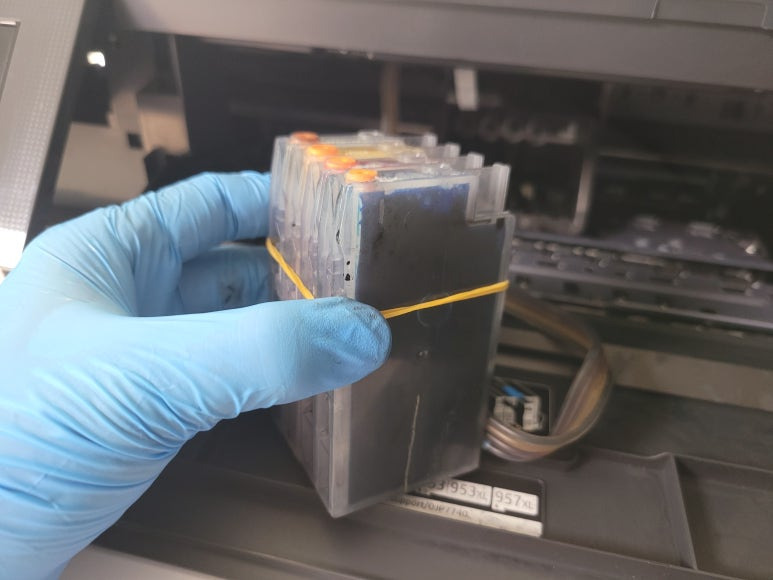 ● 프린터 헤드 클램프 부착 및 핫멜트 보강, 호스 재정리 장착