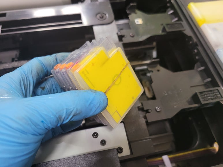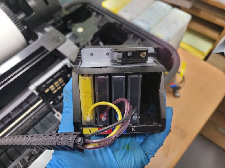 출력불량 및 잉크 카트리지 문제로 빠른 전체 점검 필요 이유 : 1. 호스 내 잉크 경화로 잉크공급 不 2. 카트리지 부싱 및 패킹 노후로 공기유입으로 잉크공급 不 3. 헤드 內 잉크공간 챔버 터짐 (칩판부 슈팅에어라인 비닐탈락, PCB 오염) 4. 스테이션 펌핑모터 불량으로 인한 잉크공급 不