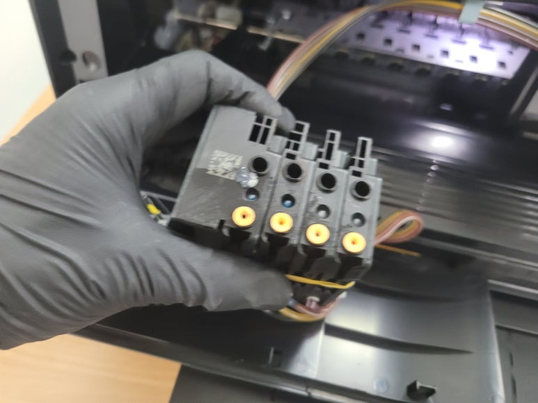 출력불량 및 잉크 카트리지 문제로 빠른 전체 점검 필요 이유 : 1. 호스 내 잉크 경화로 잉크공급 不 2. 카트리지 부싱 및 패킹 노후로 공기유입으로 잉크공급 不 3. 헤드 內 잉크공간 챔버 터짐 (칩판부 슈팅에어라인 비닐탈락, PCB 오염) 4. 스테이션 펌핑모터 불량으로 인한 잉크공급 不