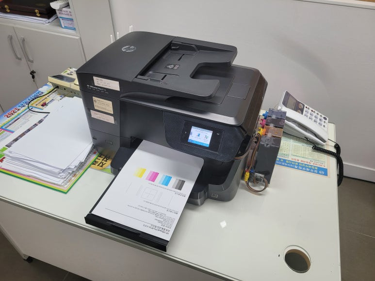 경기도 고양시 덕양구 지축동 소재, 부동산공인중개사 사무실에서 스캔, 복사 및 팩스 및 문서 출력용으로 사용하는 HP OfficeJet Pro 8710 팩스복합기 무한잉크로 출력상태 불량으로 출장수리 요청으로 스케줄 맞춰 방문하여 수리 완료 했습니다.