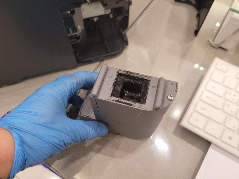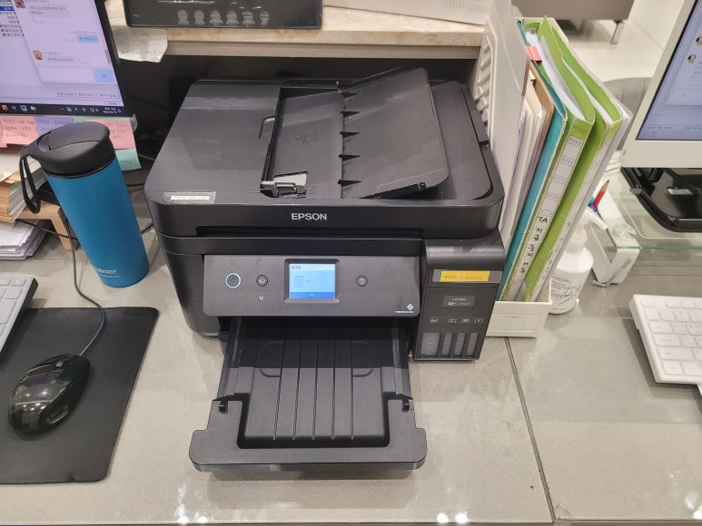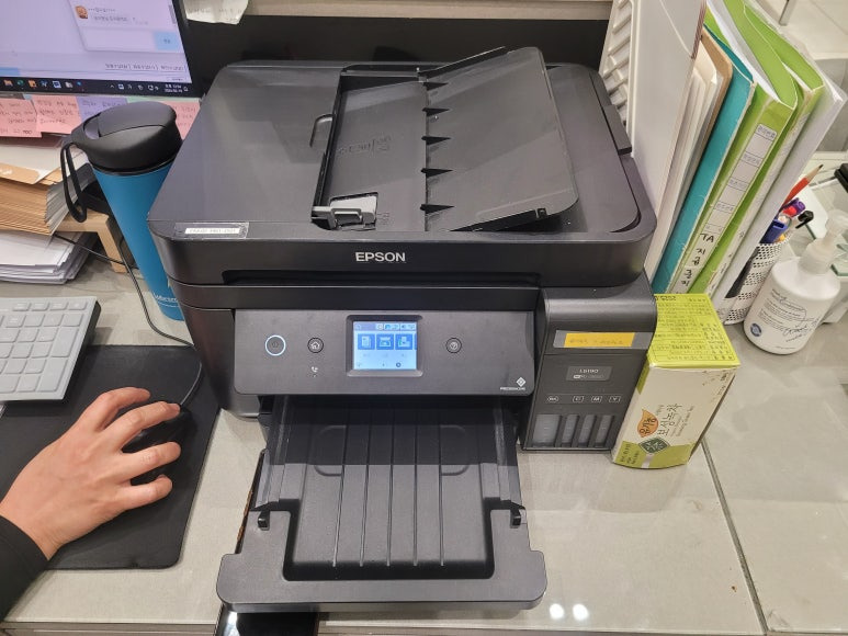 서울시 강남구 소재, 정형외과 데스크에서 팩스 및 문서용으로 사용하는 EPSON L6190 팩스복합기 (엡손 L6191, 엡손 L6291 팩스복합기 동일) 사용 중으로 잉크보충 후에 출력이 불량하고 T04D1 유지보수상자의 수명이 다 되고 인쇄불량에 대한 처리에 어려움이 있어 출장수리 요청, 스케줄 잡아 이동, 출장수리 완료했습니다.