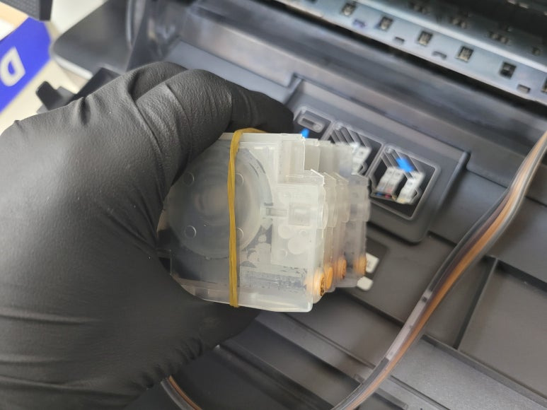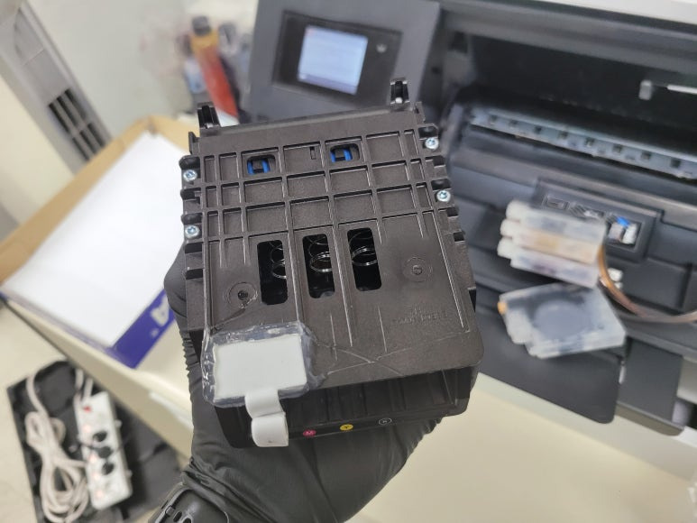 출력불량 및 잉크 카트리지 문제로 빠른 전체 점검 필요 이유 : 1. 호스 내 잉크 경화로 잉크공급 不 2. 카트리지 부싱 및 패킹 노후로 공기유입으로 잉크공급 不 3. 헤드 內 잉크공간 챔버 터짐 (칩판부 슈팅에어라인 비닐탈락, PCB 오염) 4. 스테이션 펌핑모터 불량으로 인한 잉크공급 不