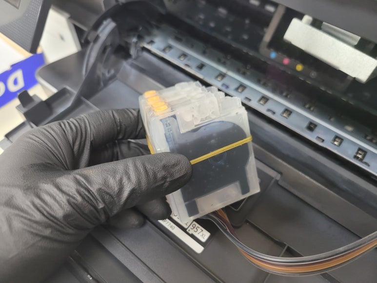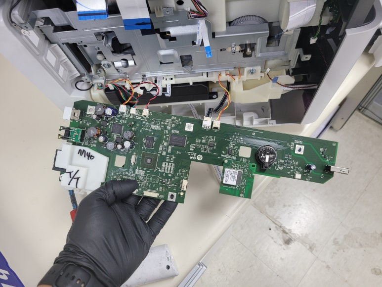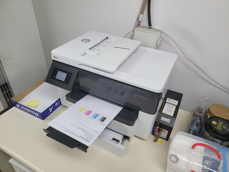 경기도 용인시 기흥구 소재, 제품연구실에서 도면출력 및 스캔, 복사, 팩스, 문서 출력용으로 사용하는 HP OfficeJet Pro 7740 팩스복합기 무한잉크로 잦은 카트리지 문제 및 소모품 시스템 문제, 타사 칩 감지됨 문제로 멈춰버린 유한 4칩 HP OfficeJet Pro 7720 팩스복합기 무한잉크 장비를 임대형 및 기업형, B2B용 (보험사, 군부대, 학교, 학원, 부동산, 핸드폰매장, 교육사 등등)으로 사용되는 칩없이 구동하는 기업형 No Chip 무칩 無Chip (Chipless Solution) 무한잉크 장비로 전환 출장수리 요청으로 스케줄 맞춰 방문하여 수리 완료 했습니다.