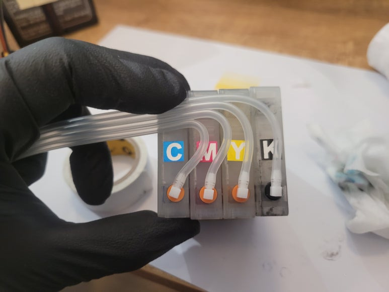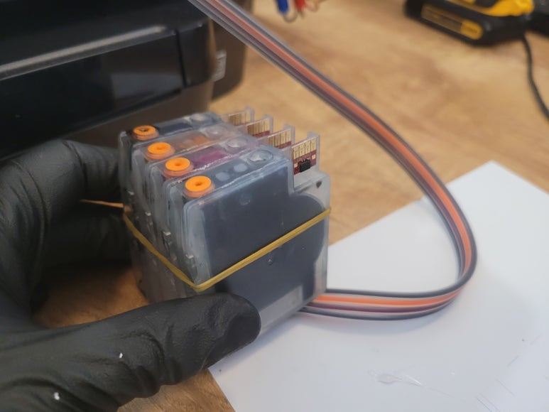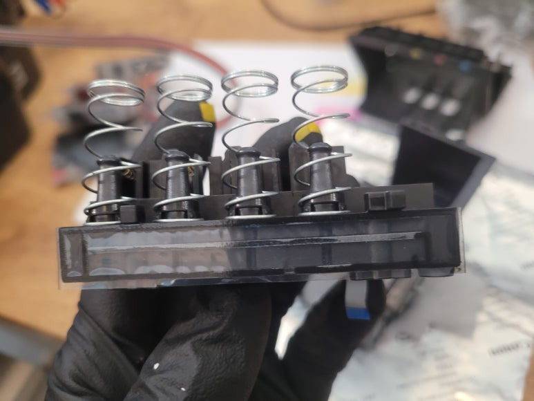 ● 프린터 헤드 클램프 부착 및 핫멜트 보강, 호스 재정리 장착
