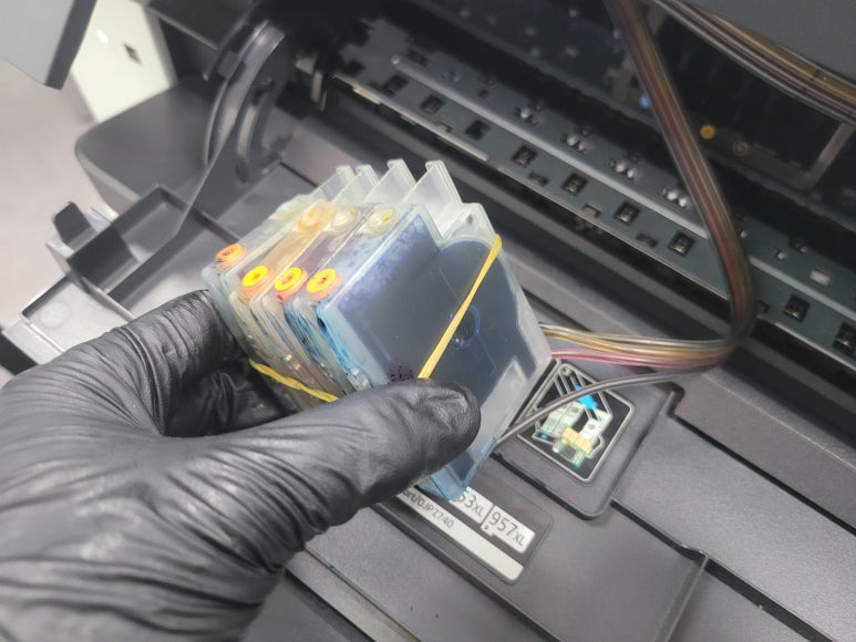 [고양시 무한잉크 출장수리] HP OfficeJet Pro 7740 팩스복합기 소모품 시스템 문제, 칩판부 비닐탈락 HP 952 프린트 헤드 분해 수리