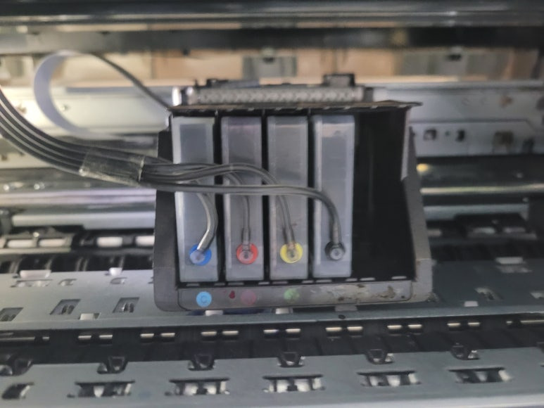 출력불량 및 잉크 카트리지 문제로 빠른 전체 점검 필요 이유 : 1. 호스 내 잉크 경화로 잉크공급 不 2. 카트리지 부싱 및 패킹 노후로 공기유입으로 잉크공급 不 3. 헤드 內 잉크공간 챔버 터짐 (칩판부 슈팅에어라인 비닐탈락, PCB 오염) 4. 스테이션 펌핑모터 불량으로 인한 잉크공급 不
