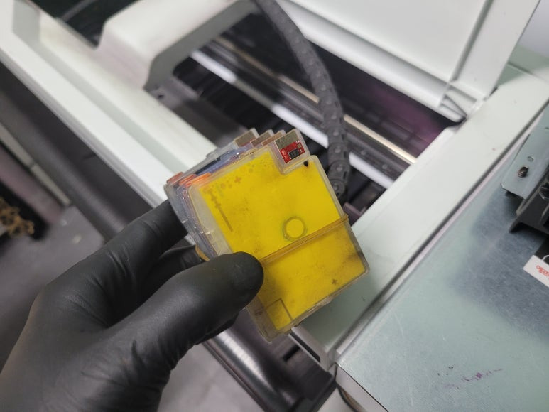 출력불량 및 잉크 카트리지 문제로 빠른 전체 점검 필요 이유 : 1. 호스 내 잉크 경화로 잉크공급 不 2. 카트리지 부싱 및 패킹 노후로 공기유입으로 잉크공급 不 3. 헤드 內 잉크공간 챔버 터짐 (칩판부 슈팅에어라인 비닐탈락, PCB 오염) 4. 스테이션 펌핑모터 불량으로 인한 잉크공급 不
