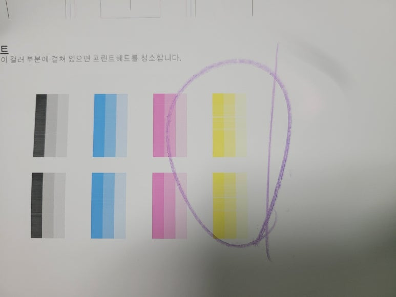 풀배경 여러장 출력시 혼색정도가 개선되지 않거나 미세 크랙시에는 색상 개선 후 2~30분후 또는 24시간이 지나면 다시 혼색되어 나옵니다. 헤드 내부의 격벽이 크랙되어 서로 각색의 잉크공간을 타고 넘어가 혼색되는 경우를 말하며 수리가 불가하므로 새헤드 교체해야 합니다. 혼색되어 그대로 사용시 제대로 된 색상은 출력되지 않지만 사용은 지속/유지 가능합니다.