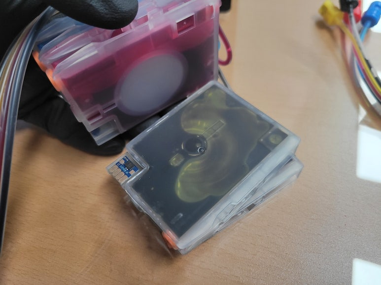 출력불량 및 잉크 카트리지 문제로 빠른 전체 점검 필요 이유 : 1. 호스 내 잉크 경화로 잉크공급 不 2. 카트리지 부싱 및 패킹 노후로 공기유입으로 잉크공급 不 3. 헤드 內 잉크공간 챔버 터짐 (칩판부 슈팅에어라인 비닐탈락, PCB 오염) 4. 스테이션 펌핑모터 불량으로 인한 잉크공급 不