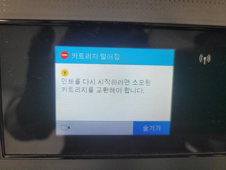 카트리지 떨어짐 / 인쇄를 다시 시작하려면 소모된 카트리지를 교환해야 합니다.