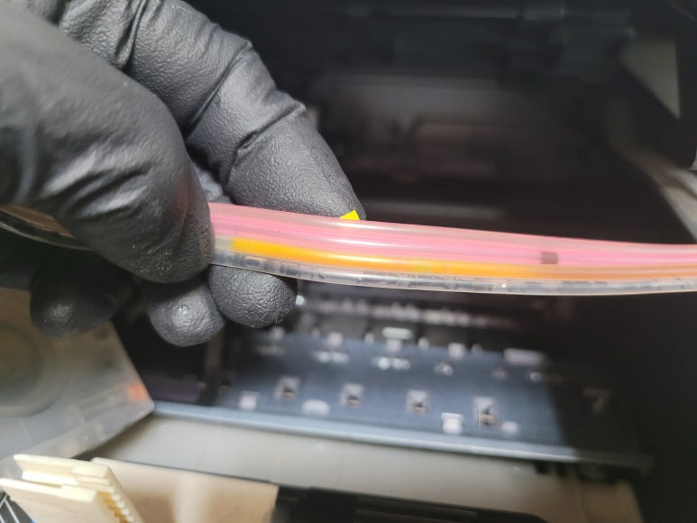● 프린터 헤드 클램프 부착 및 핫멜트 보강, 호스 재정리 장착