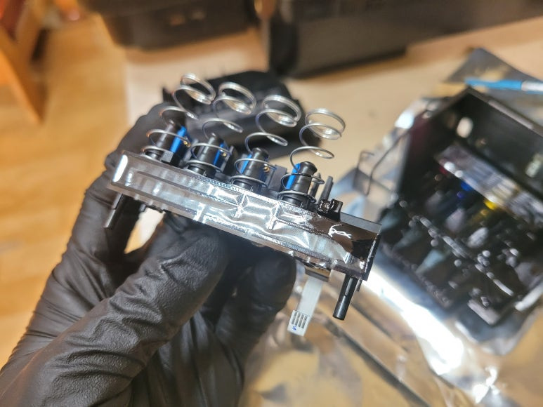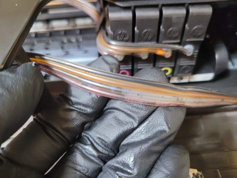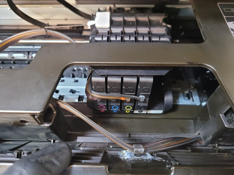 ● 프린터 헤드 클램프 부착 및 핫멜트 보강, 호스 재정리 장착