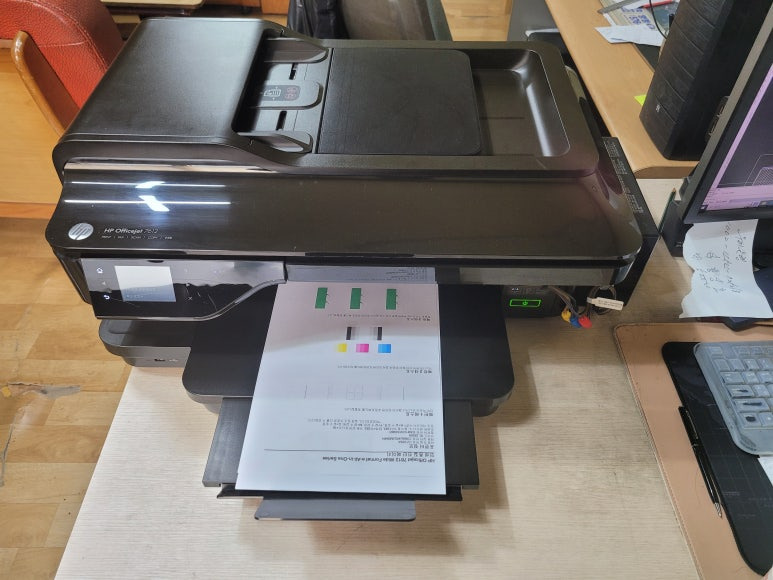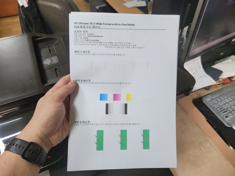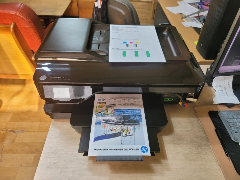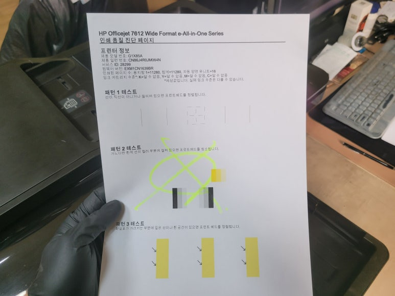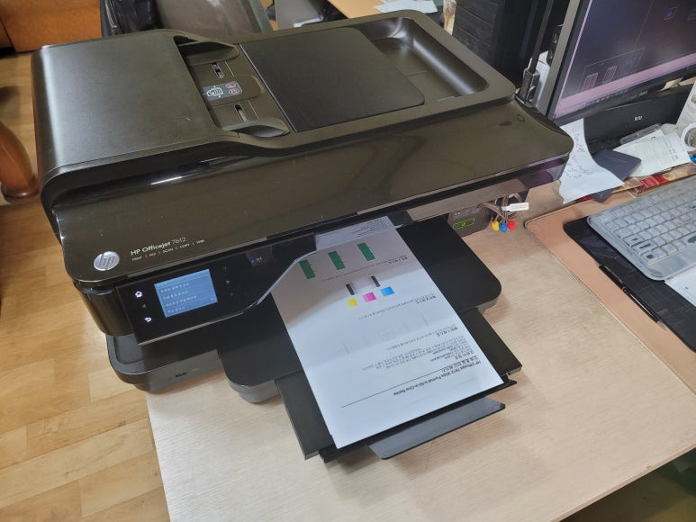 경기도 남양주시 와부읍 소재 사무실에서 A3 도면 출력 및 스캔, 복사, 팩스 및 문서출력용으로 사용중인 HP 오피스젯 프로 7612 무한잉크 팩스복합기인데 출력불량 문제로 출장수리 요청하여 스케줄 잡아 이동, 출장수리 완료했습니다.