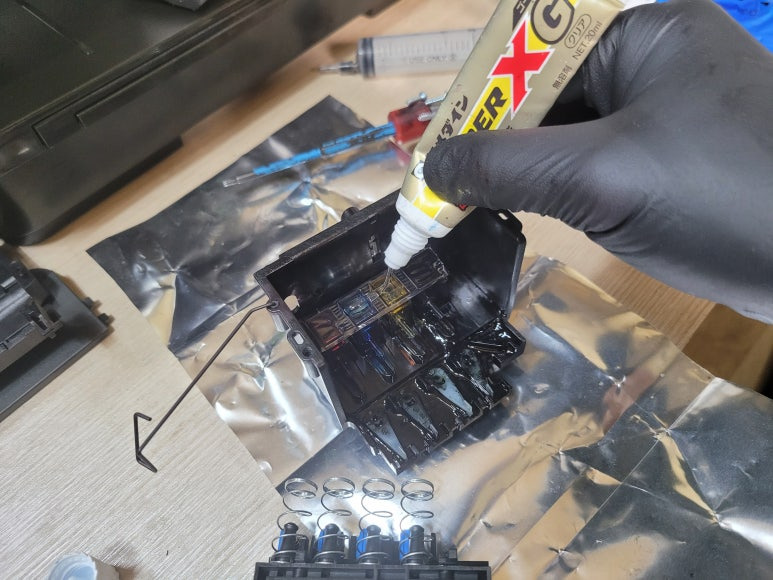 ● 프린터 헤드 챔버 터짐 탄성접착제 도포 및 테이핑