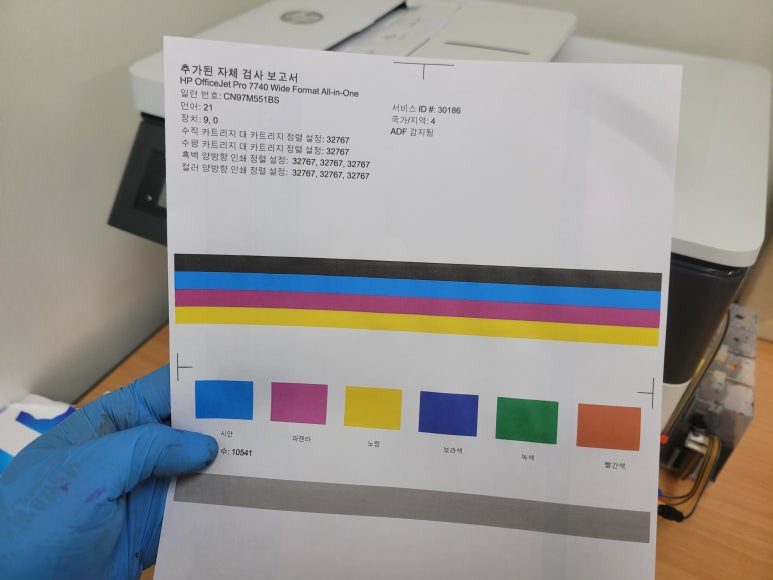 서울시 마포구 마포역 인근 소재, 도면 출력 및 팩스 및 문서 출력용으로 사용하는 HP OfficeJet Pro 7740 팩스복합기 무한잉크로 출력상태 불량으로 출장수리 요청으로 스케줄 맞춰 방문하여 수리 완료 했습니다.