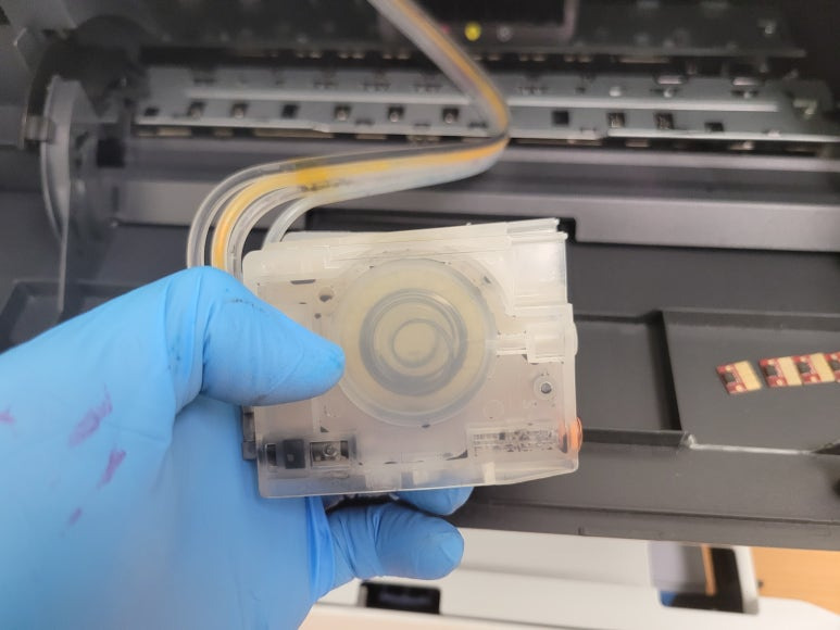 출력불량 및 잉크 카트리지 문제로 빠른 전체 점검 필요 이유 : 1. 호스 내 잉크 경화로 잉크공급 不 2. 카트리지 부싱 및 패킹 노후로 공기유입으로 잉크공급 不 3. 헤드 內 잉크공간 챔버 터짐 (칩판부 슈팅에어라인 비닐탈락, PCB 오염) 4. 스테이션 펌핑모터 불량으로 인한 잉크공급 不