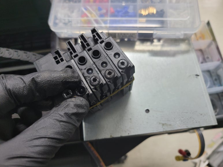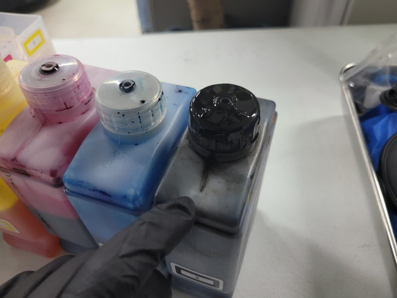 출력불량 및 잉크 카트리지 문제로 빠른 전체 점검 필요 이유 : 1. 호스 내 잉크 경화로 잉크공급 不 2. 카트리지 부싱 및 패킹 노후로 공기유입으로 잉크공급 不 3. 헤드 內 잉크공간 챔버 터짐 (칩판부 슈팅에어라인 비닐탈락, PCB 오염) 4. 스테이션 펌핑모터 불량으로 인한 잉크공급 不