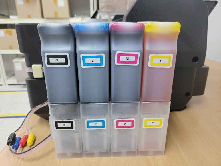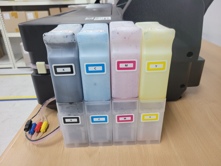출력불량 및 잉크 카트리지 문제로 빠른 전체 점검 필요 이유 : 1. 호스 내 잉크 경화로 잉크공급 不 2. 카트리지 부싱 및 패킹 노후로 공기유입으로 잉크공급 不 3. 헤드 內 잉크공간 챔버 터짐 (칩판부 슈팅에어라인 비닐탈락, PCB 오염) 4. 스테이션 펌핑모터 불량으로 인한 잉크공급 不