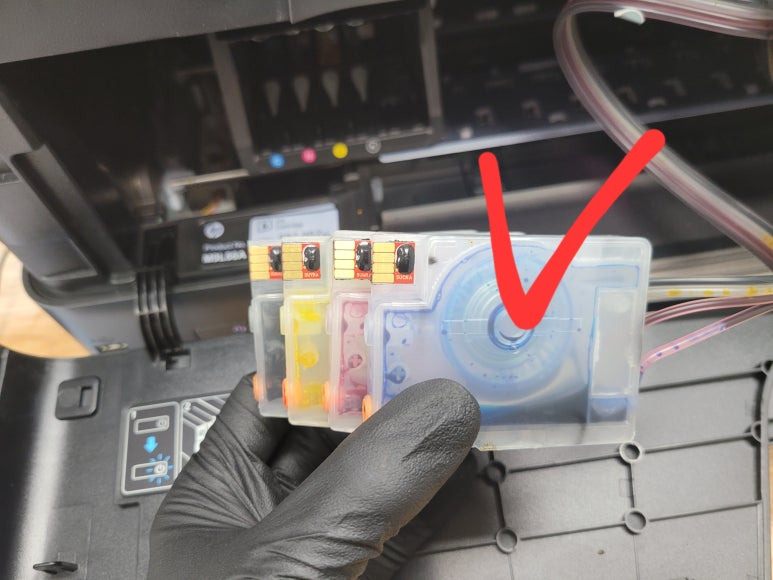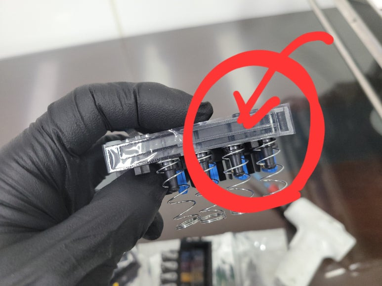 출력불량 및 잉크 카트리지 문제로 빠른 전체 점검 필요 이유 : 1. 호스 내 잉크 경화로 잉크공급 不 2. 카트리지 부싱 및 패킹 노후로 공기유입으로 잉크공급 不 3. 헤드 內 잉크공간 챔버 터짐 (칩판부 슈팅에어라인 비닐탈락, PCB 오염) 4. 스테이션 펌핑모터 불량으로 인한 잉크공급 不
