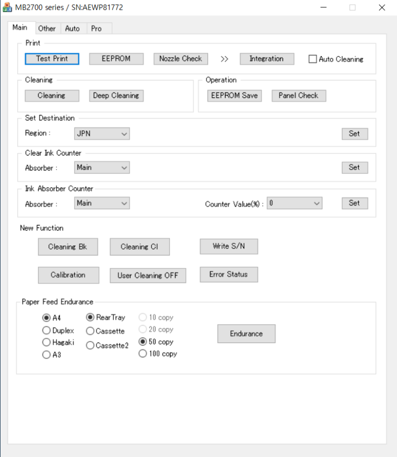 Service tool을 실행하면 상단에 MB2700 Series / SN : **** (모델명 및 시리얼 넘버)가 나타납니다. 중간 Ink Absorber Counter 메뉴에서 Set 버튼을 실행하면 0% 리셋됩니다. 정상적으로 리셋이 되면 재부팅합니다.