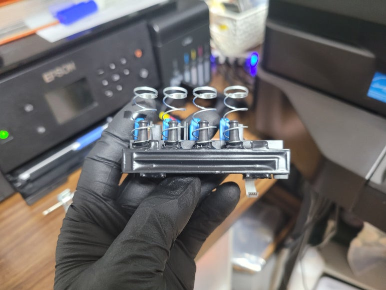 출력불량 및 잉크 카트리지 문제로 빠른 전체 점검 필요 이유 : 1. 호스 내 잉크 경화로 잉크공급 不 2. 카트리지 부싱 및 패킹 노후로 공기유입으로 잉크공급 不 3. 헤드 內 잉크공간 챔버 터짐 (칩판부 슈팅에어라인 비닐탈락, PCB 오염) 4. 스테이션 펌핑모터 불량으로 인한 잉크공급 不