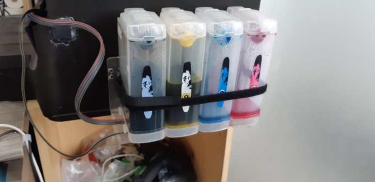 잉크 카트리지 소모됨 및 공급기 잉크통에 잉크 고갈, 카트리지 내부 잉크 소모됨 및 호스, 공급선이 심하게 훼손되어 있었습니다.