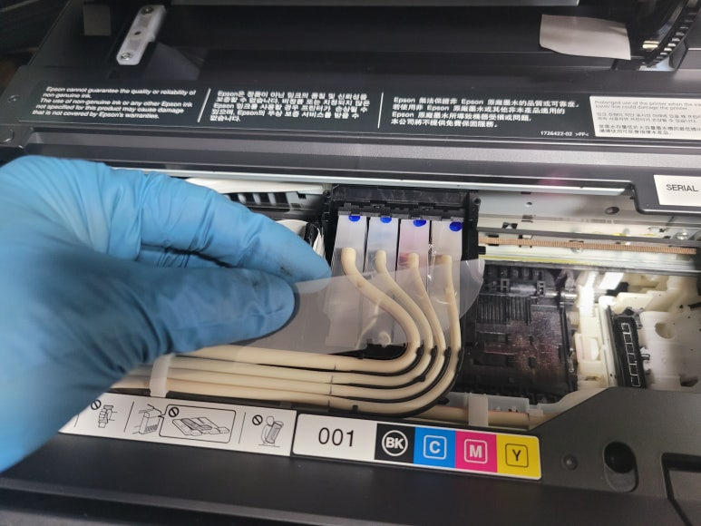 고정되어 있는 잉크공급라인, 호스도 풀었습니다.
