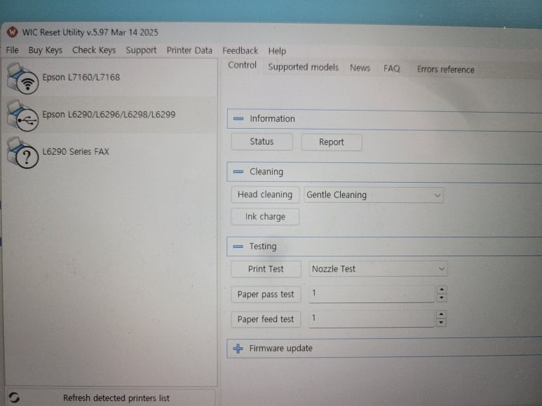 WIC Reset Utility 프로그램으로 Ink charge 실행하여 잉크를 호스 및 카트리지, 헤드 및 노즐부 배출하여 폐잉크를 유지보수상자로 배출 처리 및 신선하고 맑은 잉크로 채웠습니다.
