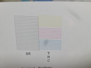 헤드 청소를 자주한 장비로 노즐 점검하면 위와 같이 매우 4색 모두 출력 상태 불량하게 나옵니다.