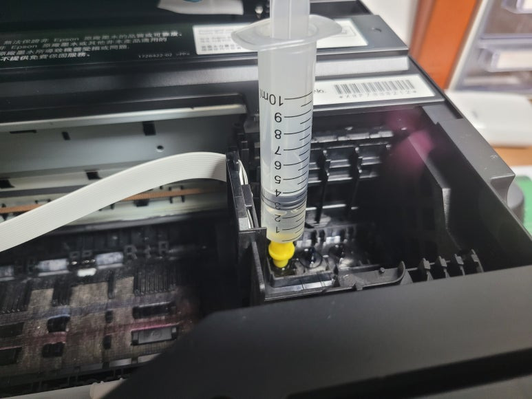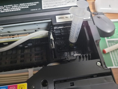 헤드를 서비스 스테이션 구역인 오른쪽으로 밀어 넣은 후에 프린트 헤드에 세졍액을 4~5ml 최대한 천천히 주입하여 세정했습니다.