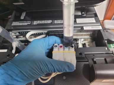 4색 카트리지를 안전하게 고무줄로 묶고 석션하여 비워 있는 카트리지에 잉크를 모두 채우고, 추가로 좀 더 잉크를 빼내어 잉크공급라인에 멈춰 잉크 흐름을 방해하는 경화된 잉크를 최대한 빼내어 호스 크리닝 했였습니다.