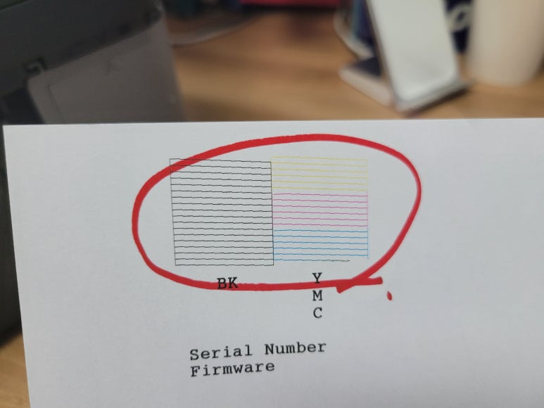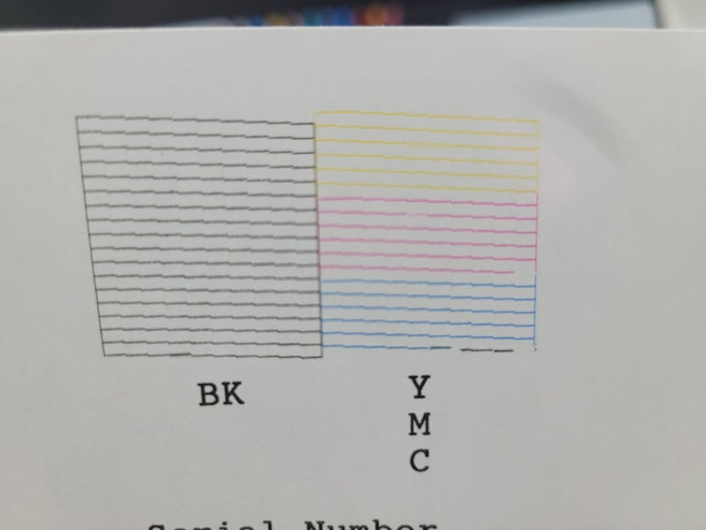 노즐 점검 출력 마젠타 (빨강) 색상이 전혀 출력되지 않고 있습니다.