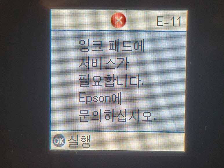 E-11 잉크 패드에 서비스가 필요합니다. 잉크패드(유지보수상자) 수명이 다해 패드리셋 및 교체 처리해야 합니다.