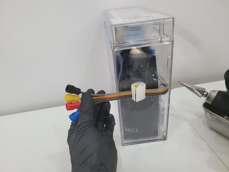 ● 프린터 헤드 클램프 부착 및 핫멜트 보강, 호스 재정리 장착