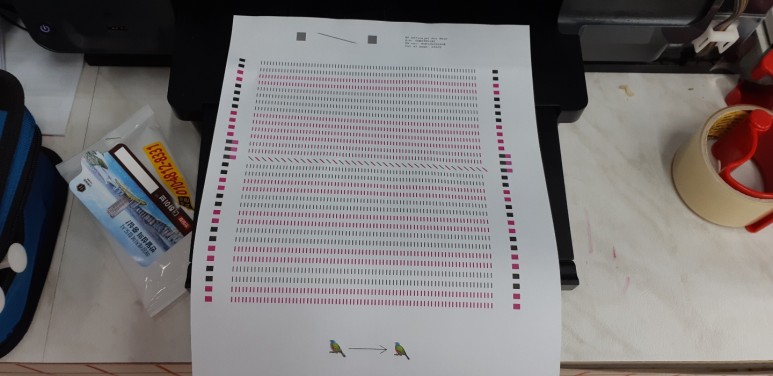 카트리지 잉크 석션하여 호스 및 카트리지 내부에 잉크를 가득 채우고 OOBE 리셋하여 정상적으로 헤드 정렬페이지가 출력되어 나왔습니다.