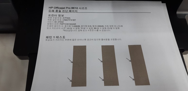 액정 한글 메뉴로 전환하고, 헤드 노즐 상태 점검을 위해 인쇄 품질 진단 페이지를 출력했습니다.