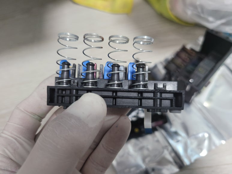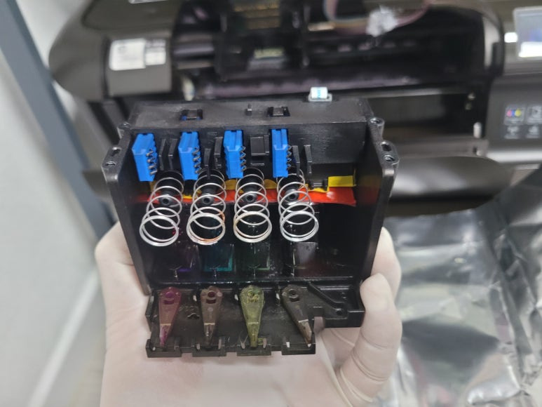출력불량 및 잉크 카트리지 문제로 빠른 전체 점검 필요 이유 : 1. 호스 내 잉크 경화로 잉크공급 不 2. 카트리지 부싱 및 패킹 노후로 공기유입으로 잉크공급 不 3. 헤드 內 잉크공간 챔버 터짐 (칩판부 슈팅에어라인 비닐탈락, PCB 오염) 4. 스테이션 펌핑모터 불량으로 인한 잉크공급 不