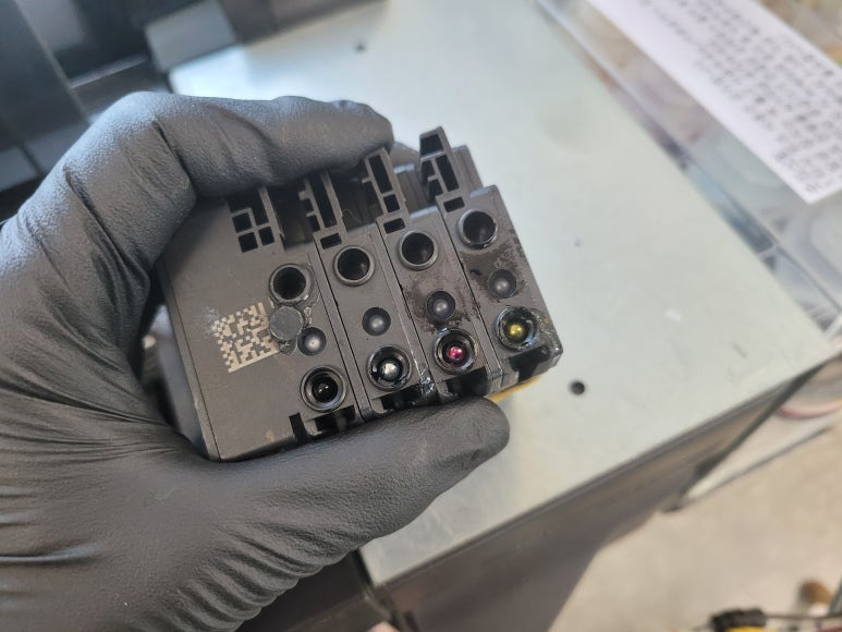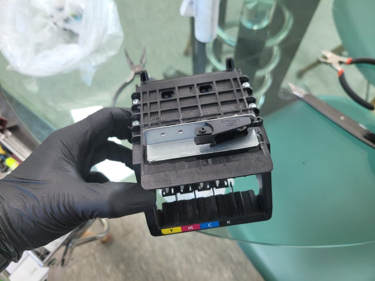 출력불량 및 잉크 카트리지 문제로 빠른 전체 점검 필요 이유 : 1. 호스 내 잉크 경화로 잉크공급 不 2. 카트리지 부싱 및 패킹 노후로 공기유입으로 잉크공급 不 3. 헤드 內 잉크공간 챔버 터짐 (칩판부 슈팅에어라인 비닐탈락, PCB 오염) 4. 스테이션 펌핑모터 불량으로 인한 잉크공급 不
