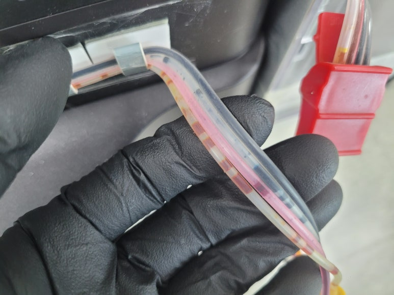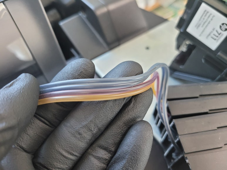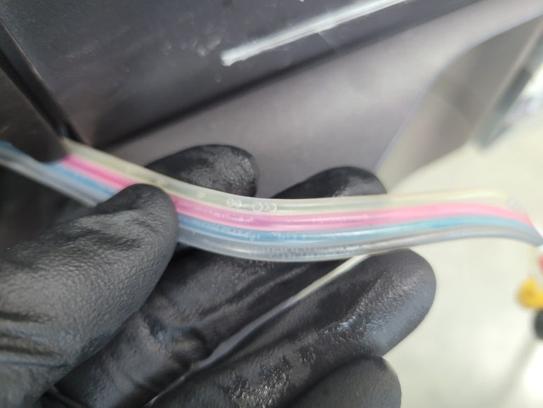 ● 잉크공급라인 호스 내부 잉크 경화 현상으로 세정액 세척