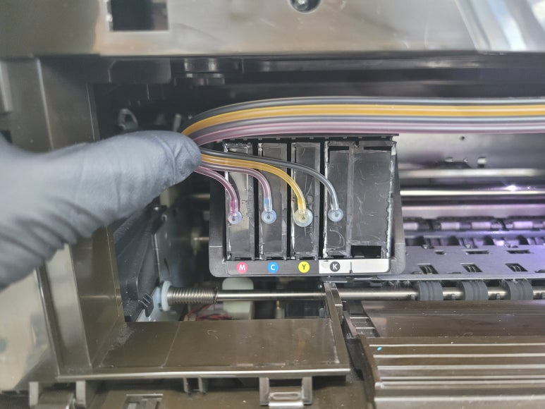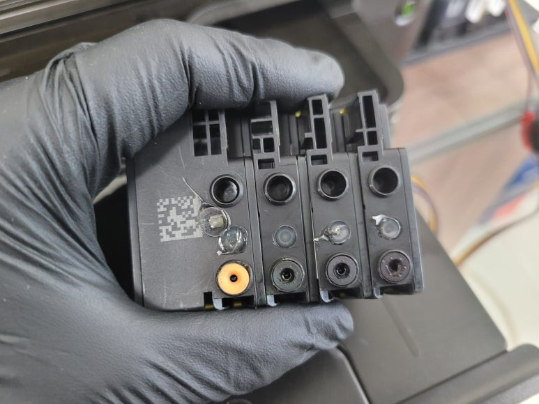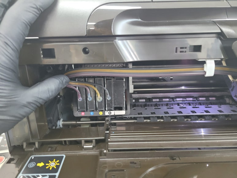 출력불량 및 잉크 카트리지 문제로 빠른 전체 점검 필요 이유 : 1. 호스 내 잉크 경화로 잉크공급 不 2. 카트리지 부싱 및 패킹 노후로 공기유입으로 잉크공급 不 3. 헤드 內 잉크공간 챔버 터짐 (칩판부 슈팅에어라인 비닐탈락, PCB 오염) 4. 스테이션 펌핑모터 불량으로 인한 잉크공급 不