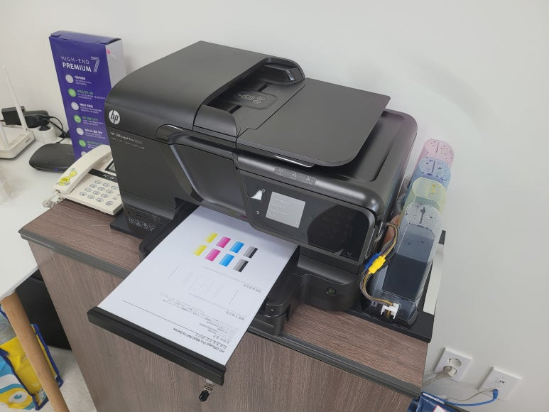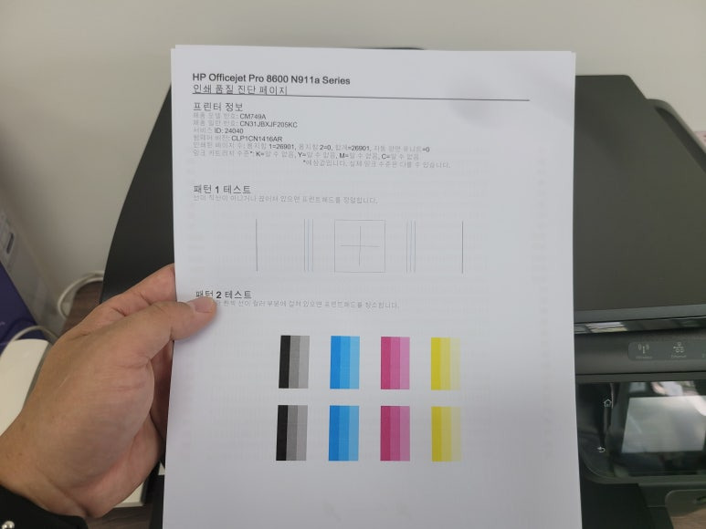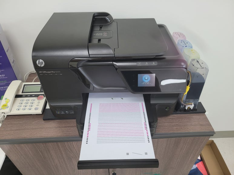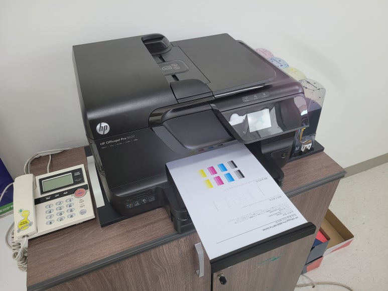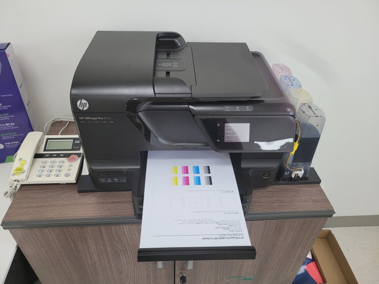 경기도 하남시 미사강변 영동스마트타워 소재 사무실에서 양면 인쇄 및 스캔, 복사, 문서출력용으로 사용하는 HP 오피스젯 프로 8600 팩스복합기 무한잉크인데 색상 혼색 출력, 출력상태 불량으로 출장수리 요청, 스케줄 잡아 이동 출장수리 완료했습니다.
