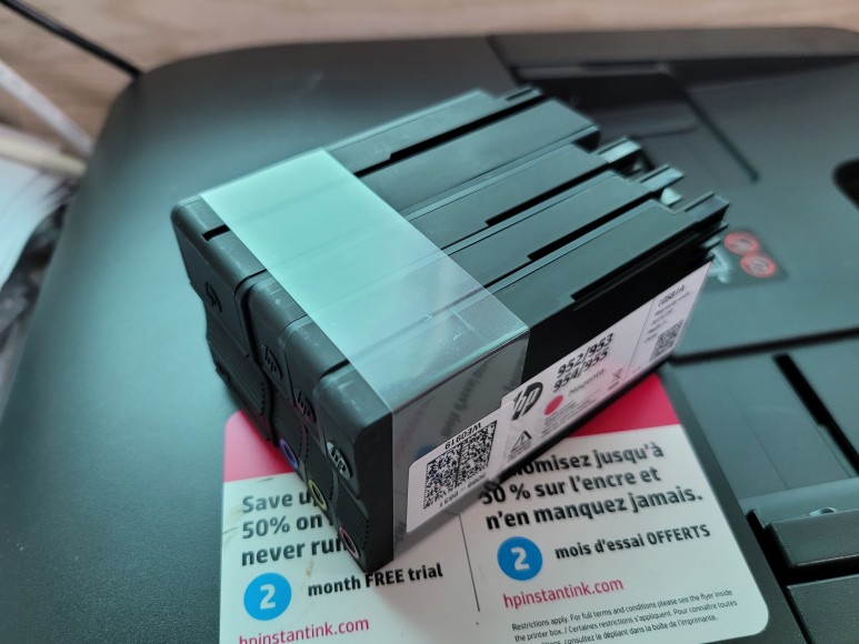 카트리지 문제 메세지가 떠 있고, 정품 카트리지 4색이 장착되어 있었습니다. 카트리지를 모두 제거했습니다. 준비해간 새 카트리지는 사용할 의미도 테스트할 필요도 없이 바로 무한잉크 장착 처리했습니다.