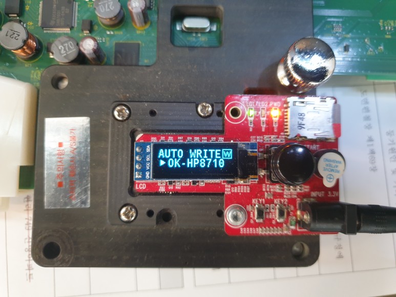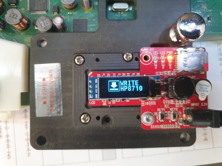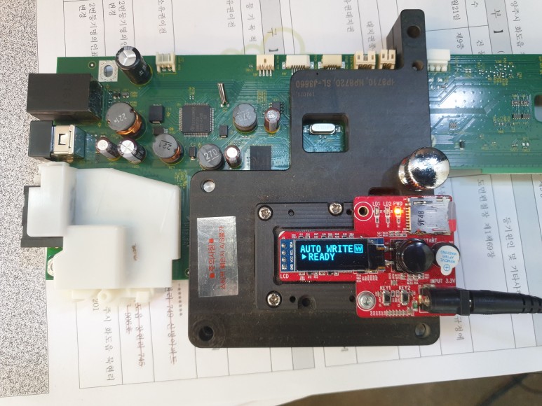 좌측 커버를 개방하고 메인보드를 땐 후에 Chipless Solution(No Chip)펌 라이팅을 위해 지그에 물렸습니다.