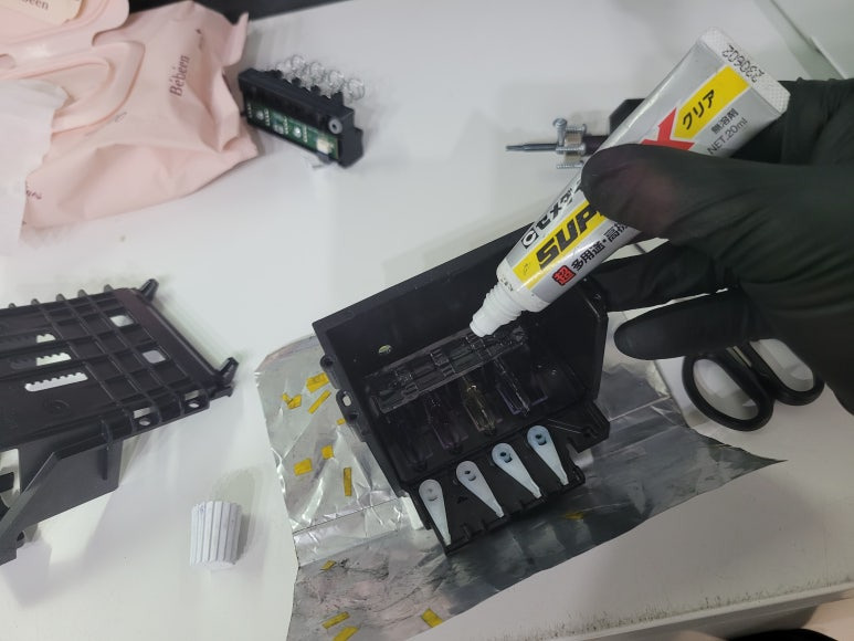 ● 프린터 헤드 챔버 터짐 탄성접착제 도포 및 테이핑