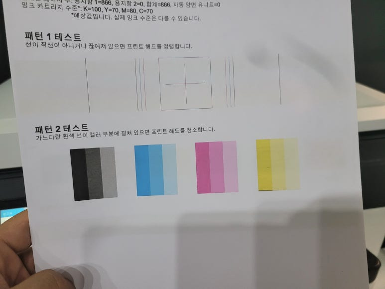 2) 매일 체크하지 않으면 노즐이 미세하게 막히면 헤드 청소를 해야 하는데 헤드청소시 이때, 잉크가 정말 많이 사용됩니다. 잉크 낭비까지 생각한다면 평소 출력해 체킹하는 게 좋습니다.(고지혈/동맥경화시 의료비가 듭니다)