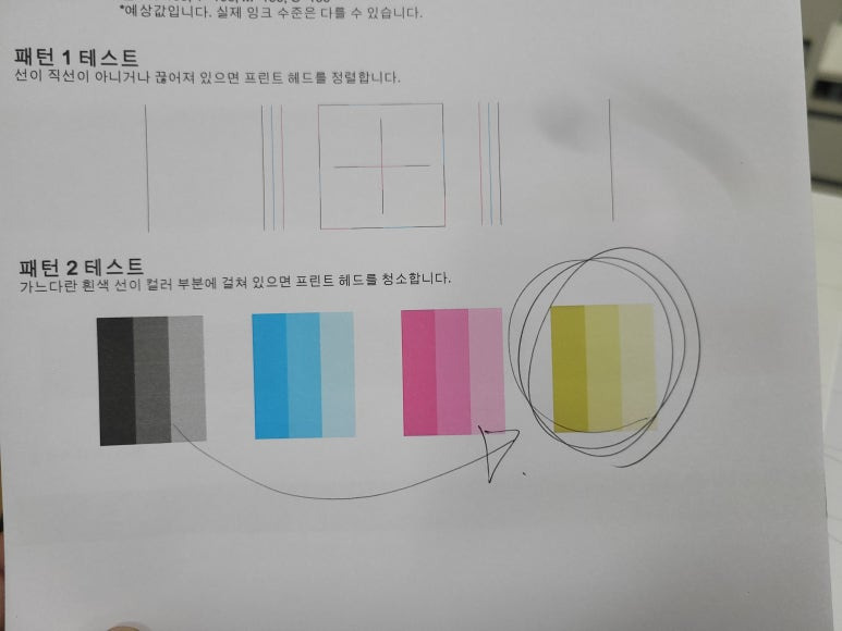⚠ 이상 시에만, 액정에서 설정 ➡ 유지 및 보수 ➡ 헤드청소 3단계 1회만 진행 (개선없다면 수리요청)
